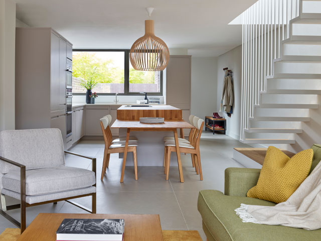 Las características arquitectónicas, como el acristalamiento aéreo, o un cambio en la altura del techo o el nivel del piso, se pueden usar para subrayar una sensación de separación entre áreas prácticas y relajación en un esquema de plan abierto. Esta renovación de la casa victoriana, incluida la extensión trasera en el nivel compartido, está en Fraher & Findlay.