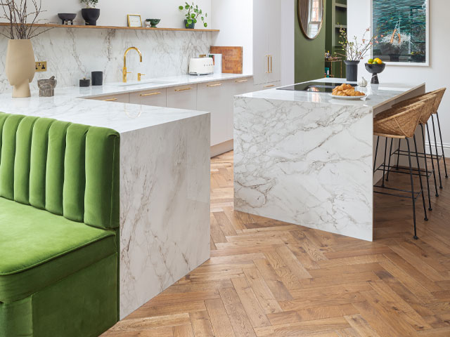 Ajuste a más personas alrededor de la mesa en un banco o banco integrado que en sillas independientes. Un diseño con una espalda alta contribuye a crear una sensación de intimidad en una habitación abierta. Esta cocina pura en La Défense con mechones de trabajo en Frit Stone es de John Lewis de Hungerford.