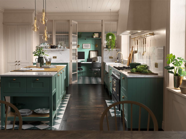 Hay muchas formas de definir áreas en una cocina gratuita, pero un bar de isla o desayuno es una de las formas más definitivas de dividir las áreas con diferentes funciones. Estos gabinetes de Shaker de Colbeck Shaker en Heritage Green con guarnición de latón provienen de las cocinas del aura.