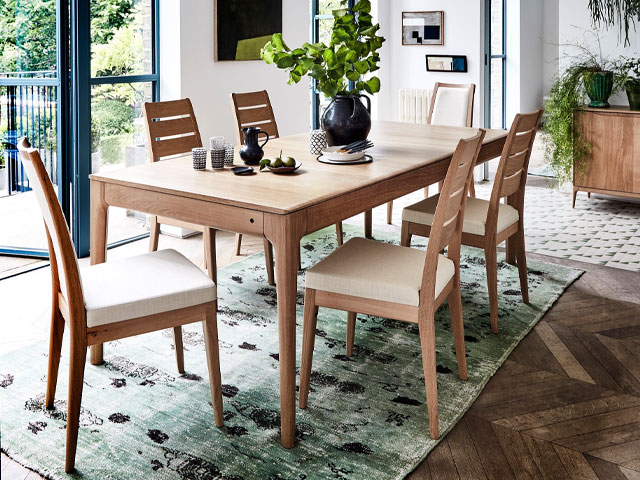 En la medida de lo posible, coloque la mesa de comedor cerca de puertas y ventanas de vidrio para disfrutar de la luz natural, la ventilación y las vistas externas. Funciona particularmente bien si tiene grandes puertas plegables o correderas que se abren en un jardín, un patio o un área de apuestas. Esta mesa de comedor de roble que extiende Romana con sillas de catering en la parte posterior es Ercol.